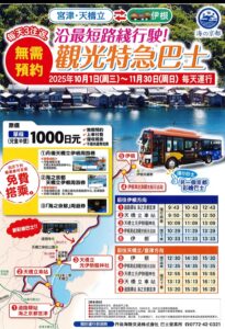 這是10月份跟11月份每天運行的觀光特快巴士, 在宮津市內有三個乘車地點, 在伊根町內有兩個下車地點。 只能用现金支付。
