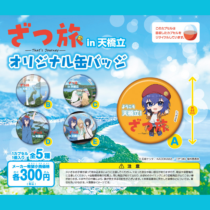 天橋立駅観光案内所にて、TVアニメ「ざつ旅ーThat’s Journeyー」とコラボした缶バッジのガ…