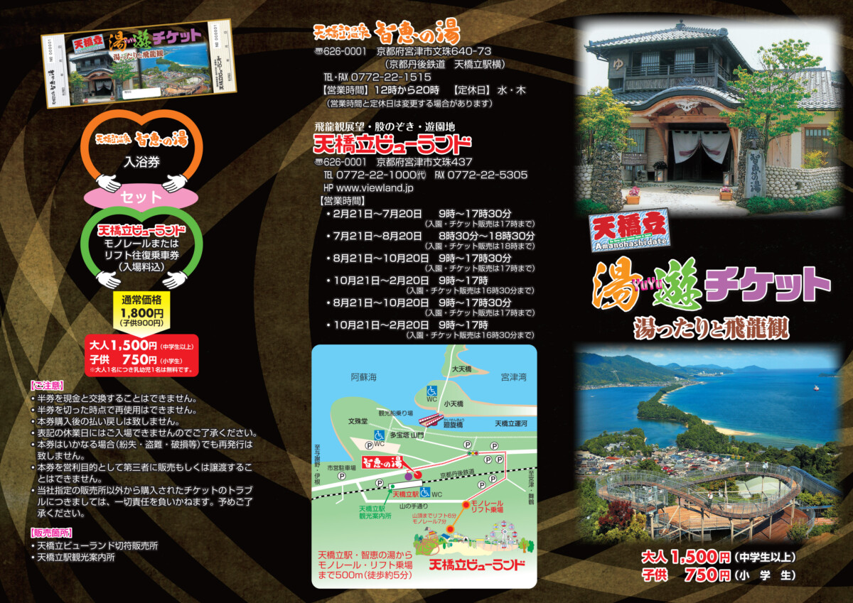 ●天橋立湯遊チケット 通常1,800円 ➡ 大人1,500円 / 子供750円