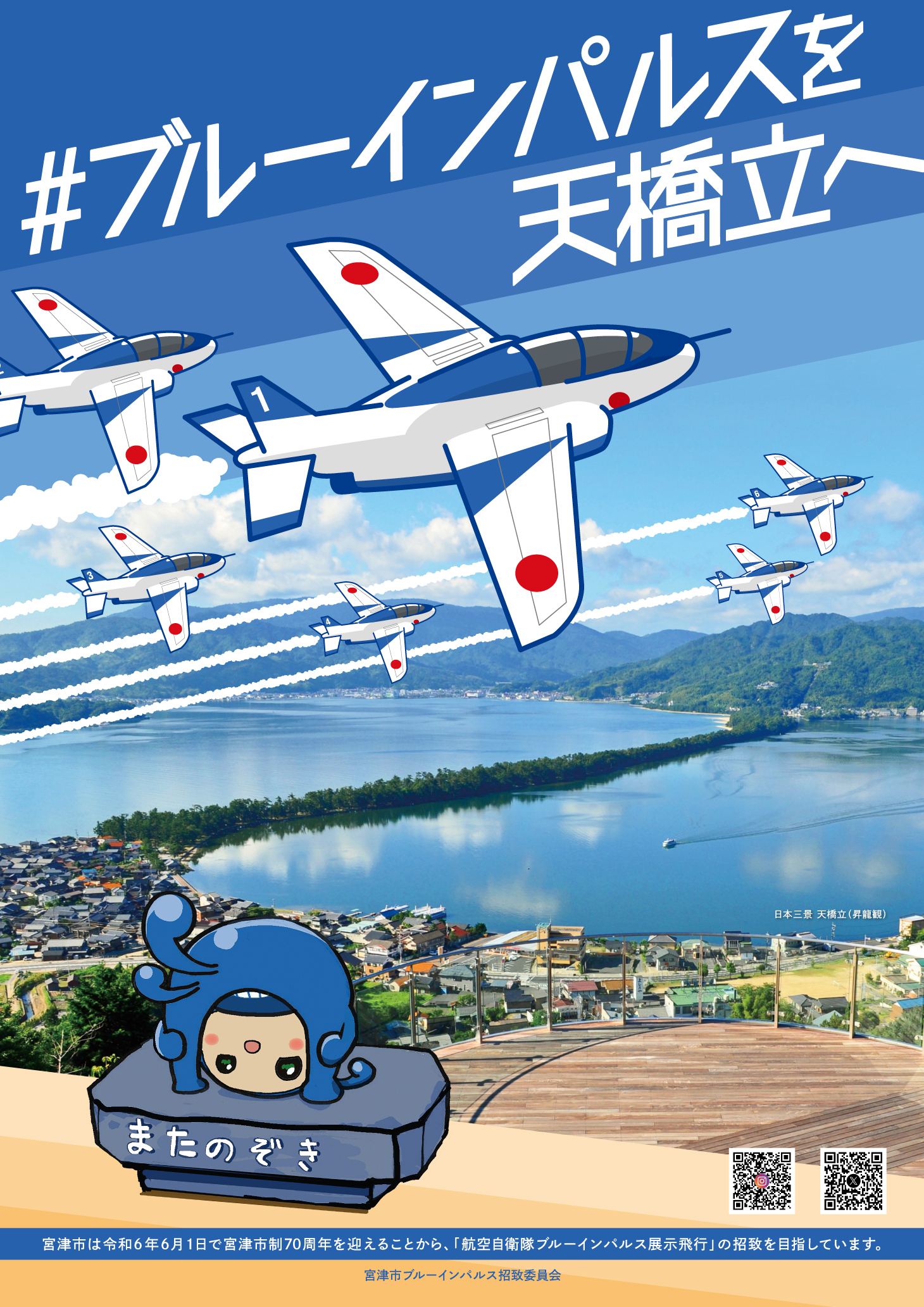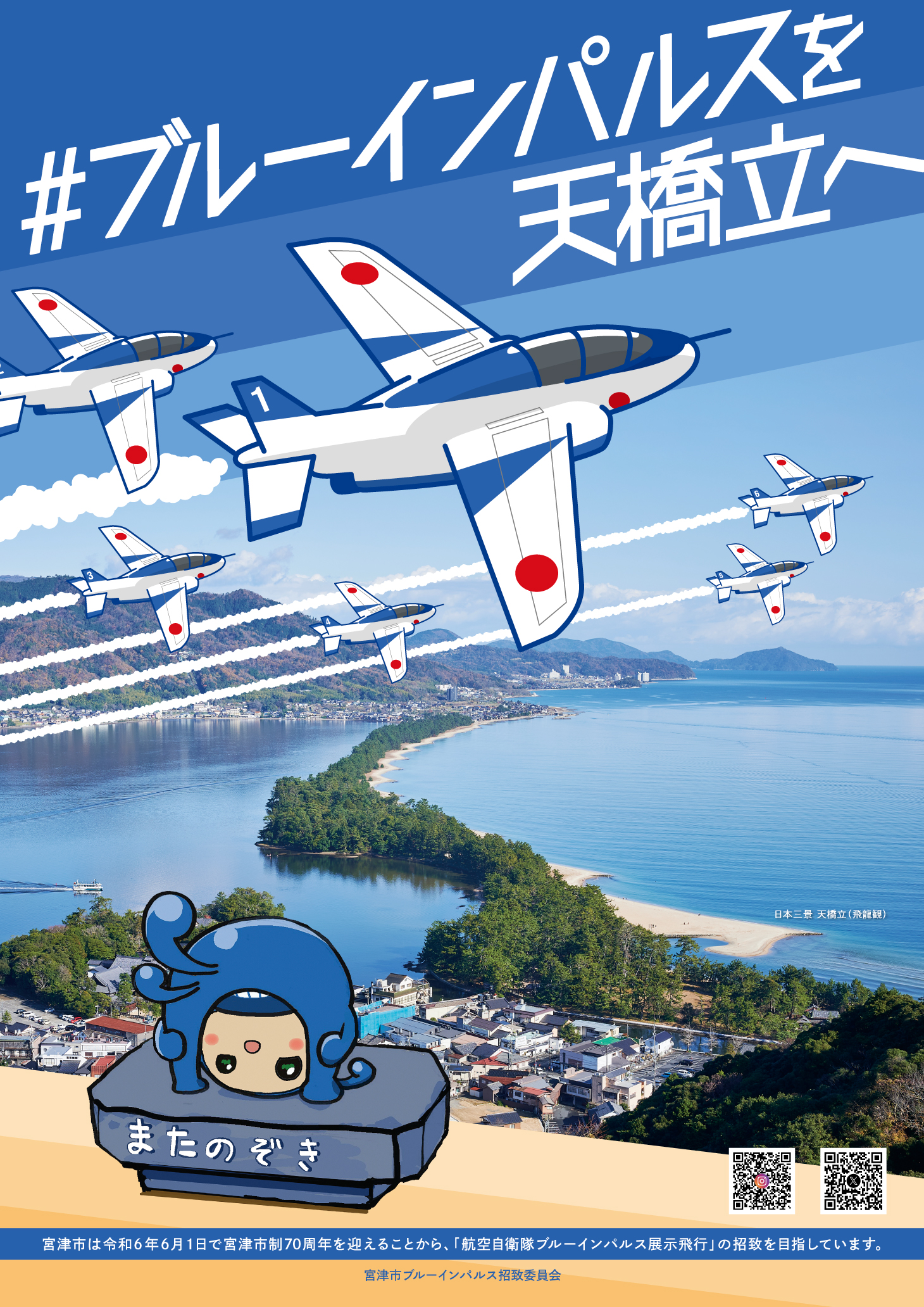 宮津市は、来年、令和6年6月1日で市制施行70周年を迎えることから、これを記念した記念事業のメイン事業として、「航空自衛隊ブルーインパルス」を招致を目指しています。