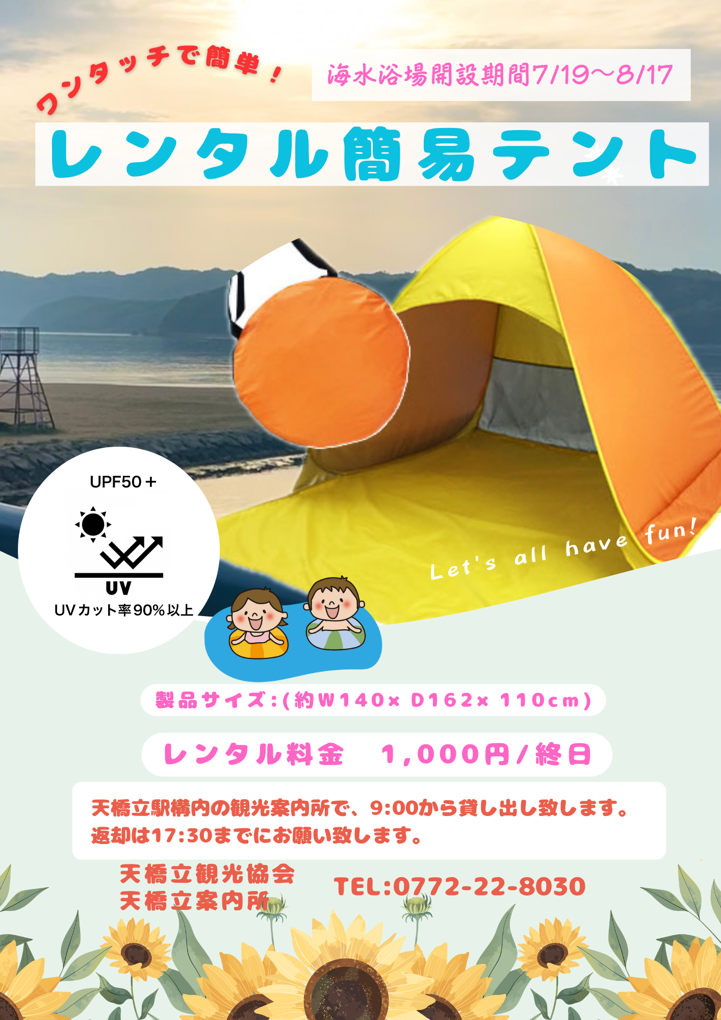 強い日差しをガード!『ビーチテント』貸出中! 2025年7月20日 お知らせ 天橋立駅観光案内所では、軽くてワンタッチで設置できる『ビーチテント』のレンタルを行っています。 天橋立海水浴場へ行く時は、手ぶらで来て、レンタルして楽しんでいただけます! 期間:7/19~8/17まで 時間:9:00~17:30 料金:1,000円/終日 ※数に限りがございますので、先着順とさせていただきます。