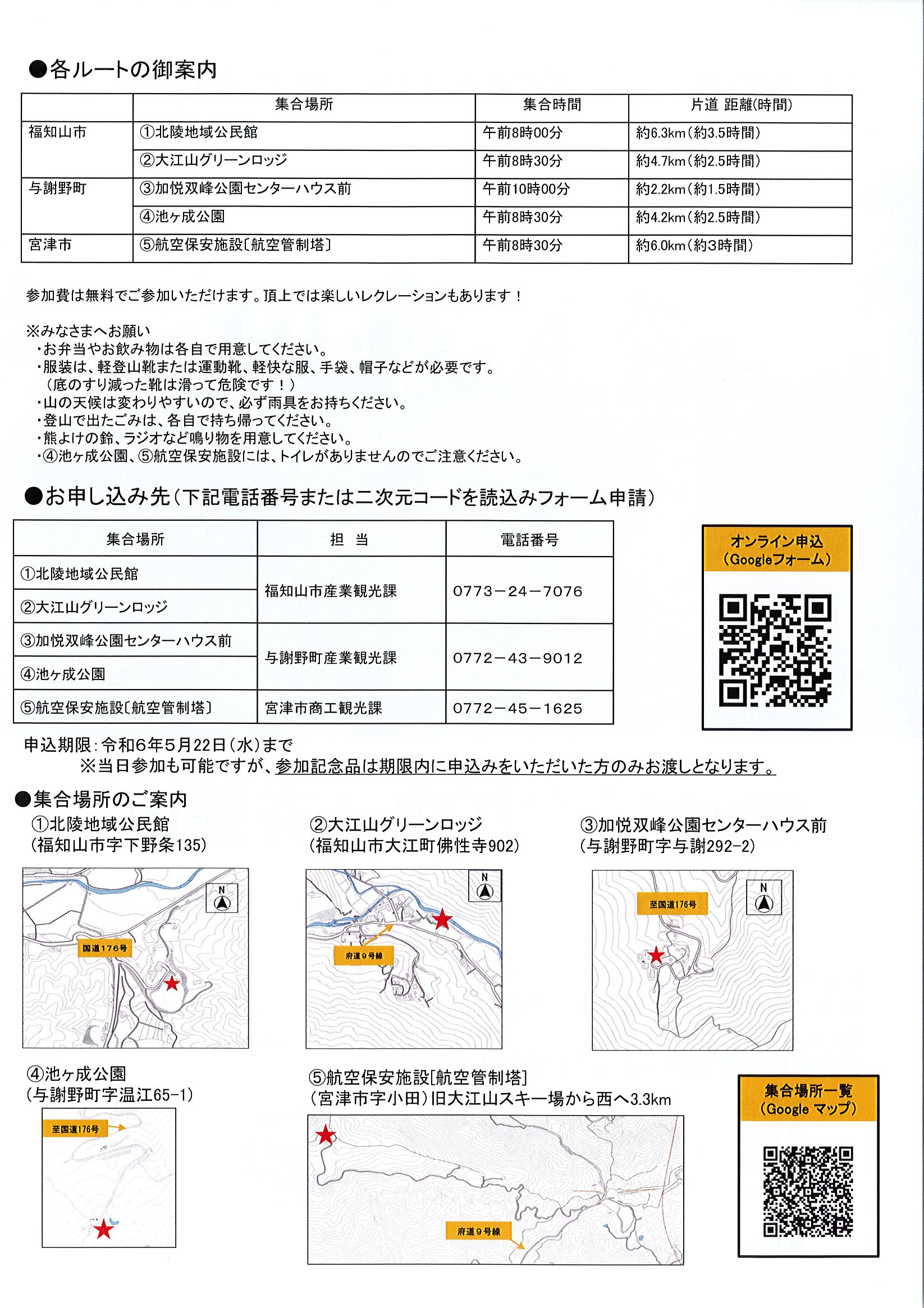 大江山一斉登山 2023年5月15日 お知らせ 大江山は国定公園に指定され、豊かな植生でも知られています。 初夏の爽やかな風と鮮やかな新緑を感じながら登ってみませんか? 登山口は5つあり、どのルートも登りやすいのでお気軽にご参加ください!(当日参加も可能です) 開催日:令和6年5月26日(日)※雨天中止 申込期限:令和5年5月22日(水) ※当日参加も可能ですが、参加記念品は期限内に申込みいただいた方のみお渡しとなります。 問い合わせ先 大江山観光開発協議会(事務局:宮津市商工観光課) TEL:0772-45-1625