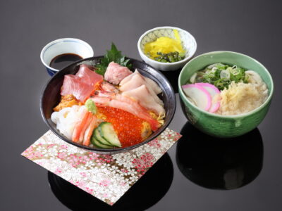 マグロ・鯛・イカ・イクラ・カニ・ウニ・甘えび等、色々な海の幸がのった、豪快などんぶりです。