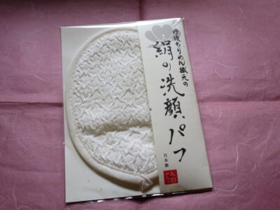 この商品は当地の地場産業丹後ちりめんの着物の生地を使い特別に作った洗顔パフです。丹後ちりめんは蚕から糸を取りだし、一本一本つなぎ合わせよりをかけ最後に熱湯につけて、さらによりをかけて糸一本一本を作り上げたおりものです。最初はつるつるしていますが、水につけてぬらすと表面がざらざらになり顔などの角質落としにぴったりになります。また、シルク100%ですので化繊と違い肌に優しいパフです。