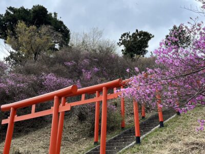 4月中旬~4月下旬に、朱色の鳥居を取り囲むように山肌をピンク色に染める「みつばつつじ」の群生地。 周…