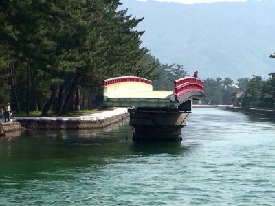 船が通るたびに90度旋回する珍しい橋で、天橋立と文殊堂のある陸地をつなぐ橋です。 大正12年に手動で…